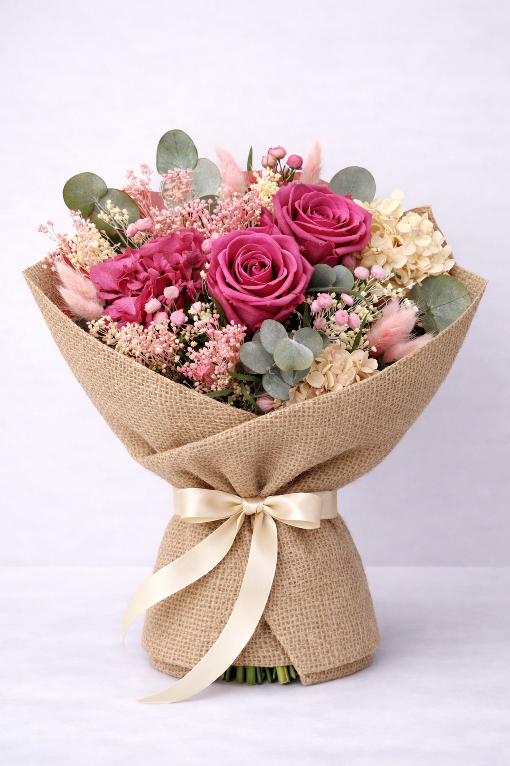 Un ramo sofisticado que evoca la delicadeza de la seda al amanecer. Aurora de Seda combina rosas fucsia de presencia intensa con hortensias en tonos crema, detalles en rosa pastel y sutiles toques de eucalipto que aportan frescura y equilibrio.