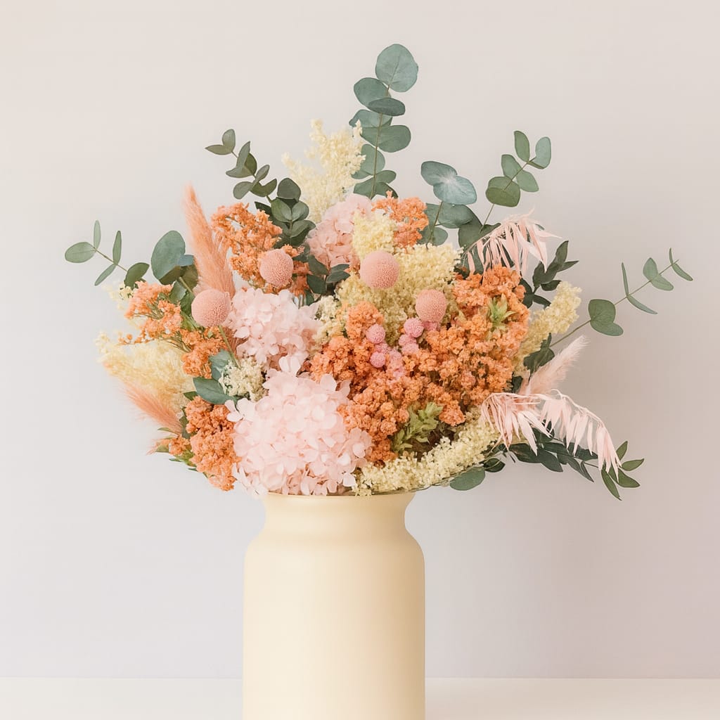 Es un arreglo floral sereno y sofisticado, inspirado en los cielos despejados y la calma absoluta. Compuesto por flores preservadas en suaves tonos azules, delicados detalles marfil y eucalipto natural, esta pieza atemporal aporta equilibrio, frescura y elegancia a cualquier espacio.