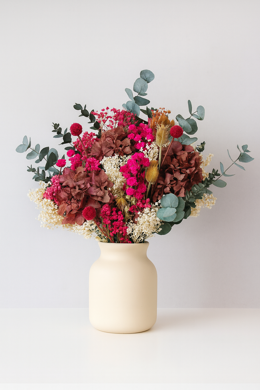Un ramo lleno de color, textura y personalidad. Esta composición combina hortensias preservadas en tonos tierra, eucalipto azul, botón billy rojo intenso, flor de arroz natural y flores preservadas en fucsia vibrante que aportan un toque moderno y sofisticado.
