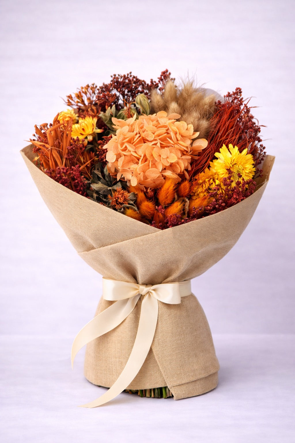 Un ramo preservado que celebra la calidez y la riqueza de los tonos otoñales. La hortensia en tono melocotón se convierte en el corazón de esta composición, acompañada de flores secas en matices terracota, mostaza y burdeos, con texturas naturales que aportan profundidad y carácter.