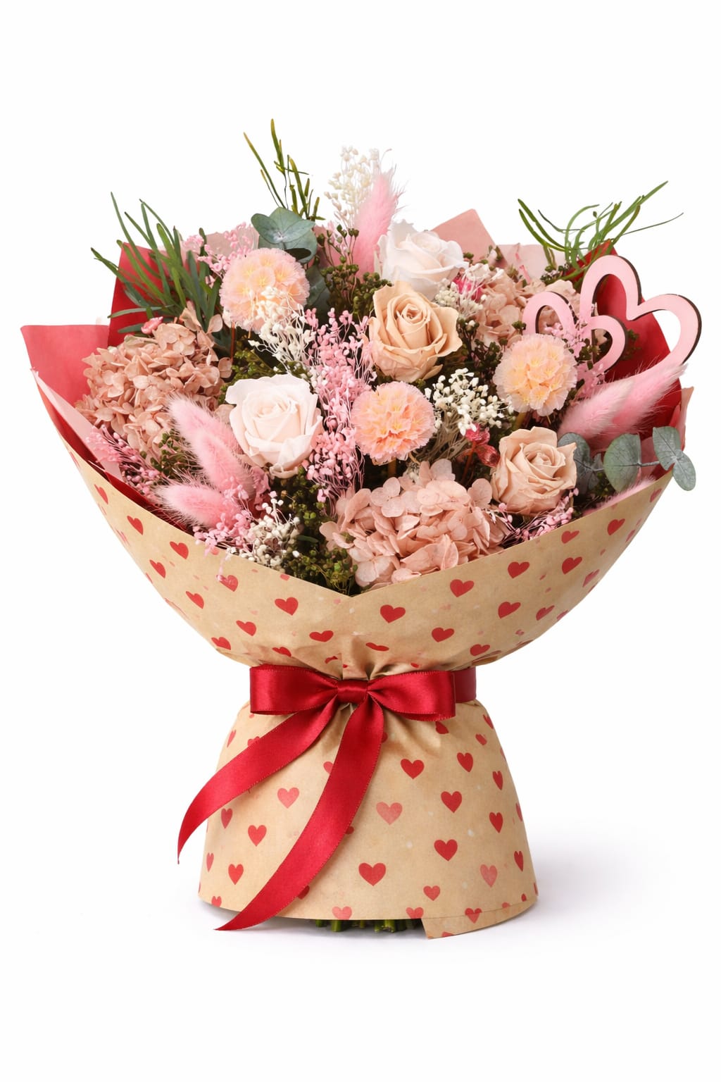 Es un bouquet suave y encantador que transmite ternura, calidez y romanticismo. Combina delicadas rosas en tonos crema y rosa empolvado con flores secas y detalles etéreos que aportan textura y armonía.