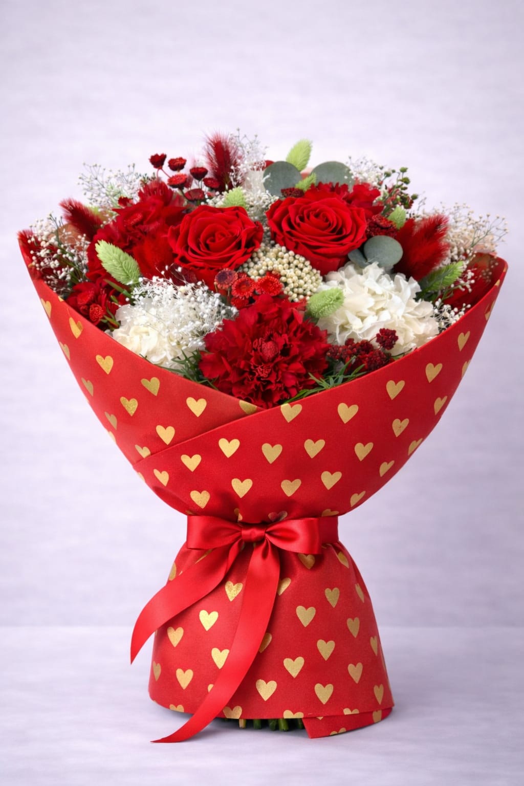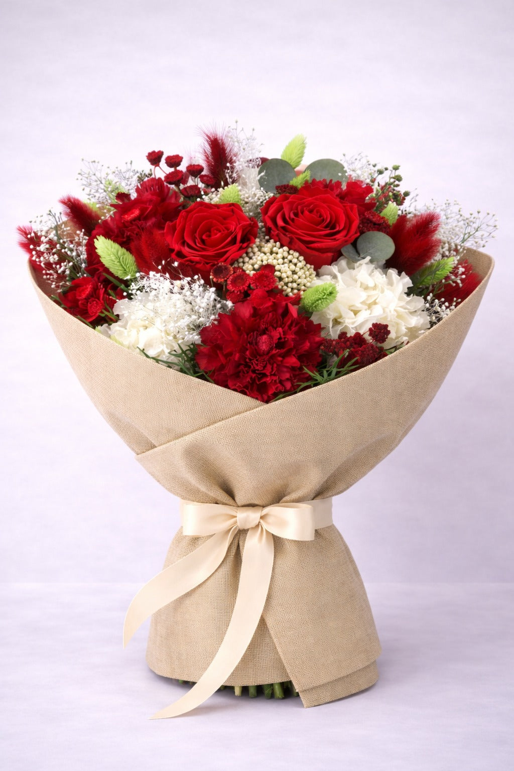 El Ramo Romance Carmesí es una elegante declaración de amor, compuesto por intensas rosas rojas combinadas con delicadas flores blancas y detalles florales de temporada. Envuelto en yute natural, es ideal para sorprender en momentos románticos y ocasiones especiales.
