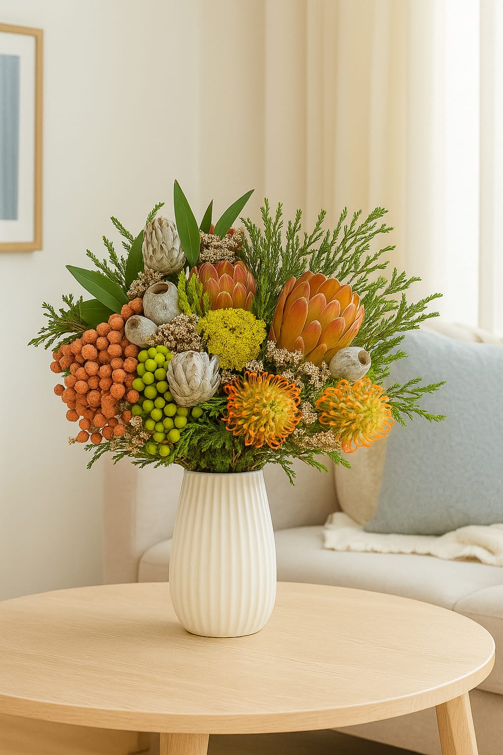 Inspirado en la belleza salvaje de la naturaleza, el Ramo Safari Dorado combina tonos ámbar, texturas terrosas y majestuosas proteas para crear un arreglo audaz y sofisticado.