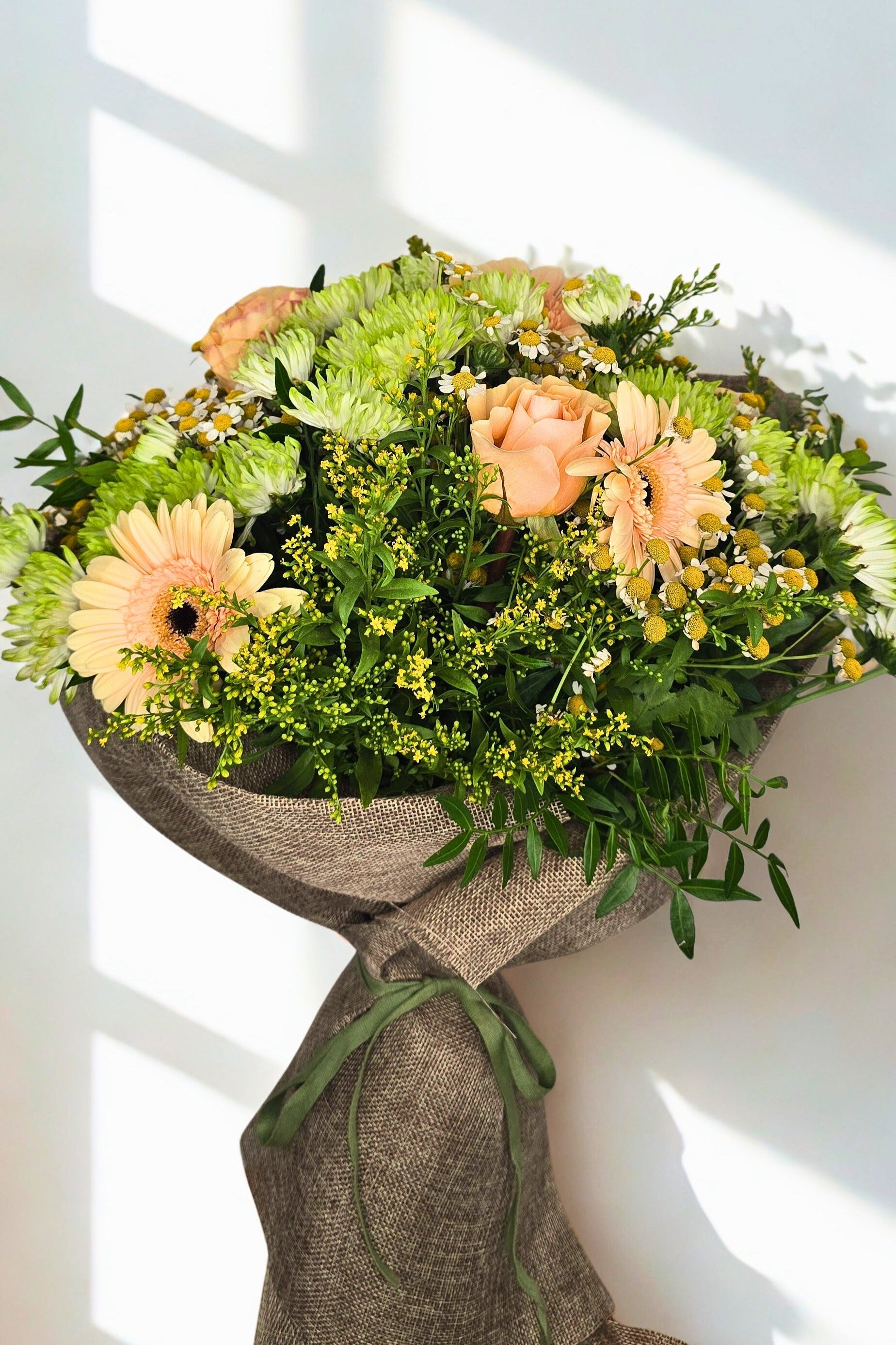 Suspiro de Melocotón Bouquet of flowers wrapped in brown paper with a green ribbon on a white background
